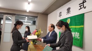 新型コロナウイルス感染症防止対策として、卒業証書授与式の様子をメイン会場と各教室の間でZOOMによる生中継を行い、卒業生1人1人に理事長から卒業証書が授与されました。それぞれの夢を実現させた学生たちが新たな夢を育てるため、巣立っていきました。コロナ禍でも、困難を乗り越えて、卒業に向けて、努力を重ねられてきた経験は、今後の人生にとって大きな糧となることと思います。ご卒業おめでとうございます。